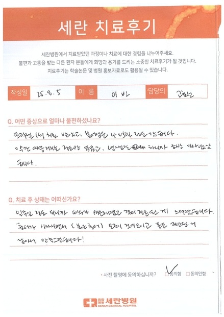 이ㅇ빈님이 세란병원 성형외과 고효선 과장님에게 보내주신 치료후기입니다. 항상 따뜻한 세란병원이 되겠습니다. 여드름 흉터를 개선하고 싶어서 프락셀치료를 받았습니다. 붉어짐은 4~5일 정도 갔고, 시술 때 약간 따끔거렸지만 냉찜질을하니까 금방 가라앉았습니다. 일주일 정도 되니까 피부가 매끈해졌고 결이 정돈된게 느껴졋고 흉터가 사라지면서 톤도 개선된거 같아서 만족스럽습니다! |