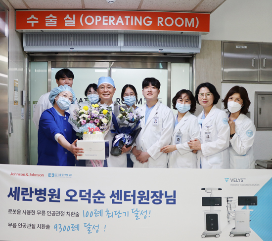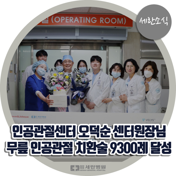 안녕하세요. 세란병원입니다. 세란병원 인공관절센터 오덕순 센터원장님 무릎 인공관절 치환술 9300례 달성(로봇을 사용한 무릎 인공관절 치환술 100례 최단기 달성)을 축하하는 기념행사가 진행되었습니다.