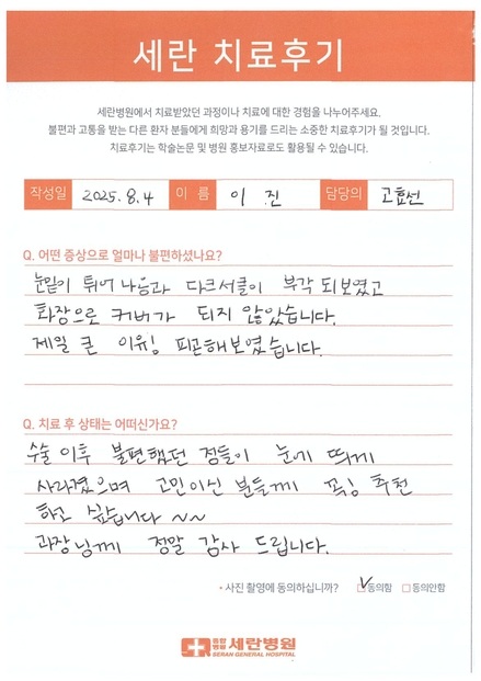 이ㅇ진님이 세란병원 성형외과 고효선 과장님에게 보내주신 치료후기입니다. 항상 따뜻한 세란병원이 되겠습니다. "눈 밑의 살이 튀어나와 다크서클이 짖어서 화장으로 커버되지 않아 주변에서 피곤해 보인다는 말을 자주 들었습니다. 수술 이후 불편했던 점들이 눈에 띄게 사라졌습니다. 눈밑지방재배치 수술이 고민이신 분들께 꼭 추천하고 싶습니다~ 과장님께 정말 감사드립니다.