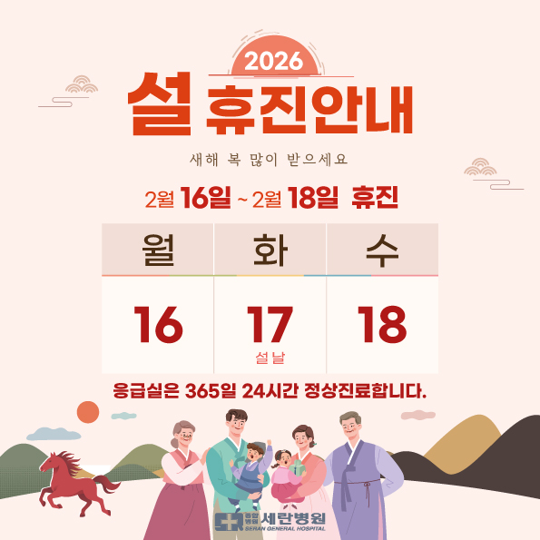 2026 설날 연휴 휴진 안내 안녕하세요. 세란병원입니다. 민족 대명절, 설날이 성큼 다가왔습니다. 세란병원의 설날 연휴 휴진 일정을 안내해 드립니다. 휴진 : 2월 16일(월) ~ 2월 18일(수) 2월 19일(목)부터 정상 진료입니다. 예약 및 내원에 착오 없으시길 바랍니다. 새해 복 많이 받으시고, 항상 건강한 기운이 함께하시길 기원합니다. |